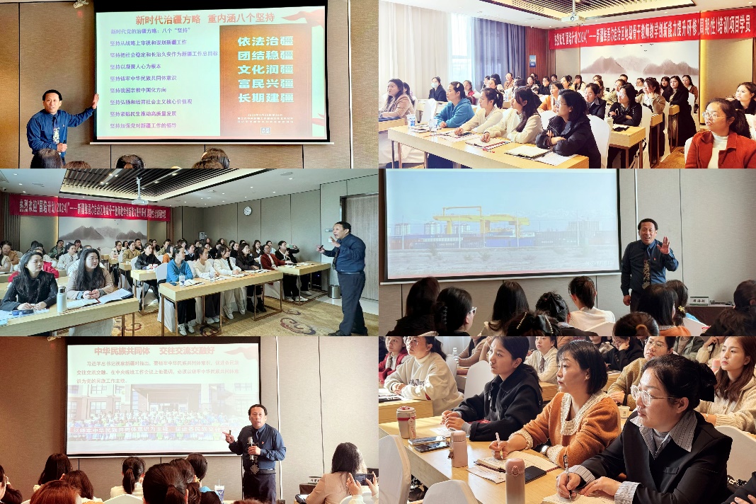 情满天山遍地春光,治疆方略生根开花。11月23日,教育部“国培计划(2024)”——新疆维吾尔自治区地级骨干教师教学创新能力提升研修(周期性)培训项目继续授课,来自新疆四个州50位教学骨干参学。徐州市委宣讲团成员、徐州市党员教育先锋师资、徐州工程学院马克思主义学院周海航副院长受邀作题为《行固本之举 成长治之疆——新时代党的治疆方略》专题报告。周海航以站立式宣讲的方式,用三个小时的时间,理论联系实际,对新时代党的治疆方略进行了深刻阐释。报告强调,要完整准确地理解新时代党的治疆方略的重大意义、思想内涵、基本特征,既要理解其内容,也要理解其历史逻辑、理论逻辑和实践逻辑,学以致用,牢牢扭住社会稳定和长治久安总目标,发挥教育科技人才的基础性战略性支撑作用,奋力谱写中国式现代化新疆篇章。报告受到新疆参培教学骨干的热烈欢迎。