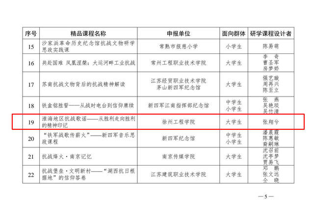 近日,江苏省文化和旅游厅、江苏省教育厅和新华日报社共同发布《关于公布第二批江苏省红色研学精品思政课程名单的通知》(苏文旅发〔2025〕95号)。由我院张翔兮老师设计申报的课程《淮海地区抗战歌谣——从胜利走向胜利的精神印记》成功入选。