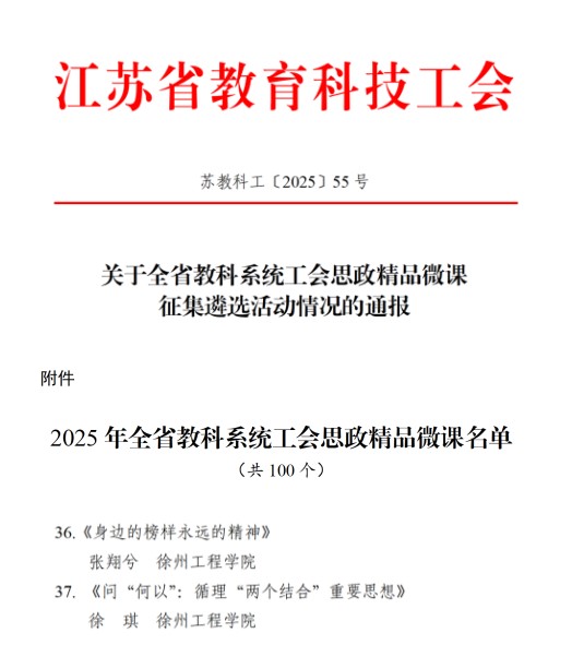 近日,江苏省教育科技工会发布《关于全省教科系统工会思政精品微课征集遴选活动情况的通报》(苏教科工[2025]55号),同步公布2025年全省教科系统工会思政精品微课获奖名单。我院选送的由张翔兮老师主讲的《身边的榜样 永远的精神》和徐琪老师主讲的《问“何以”:循理“两个结合”重要思想》两门微课,双双入选省级精品微课。